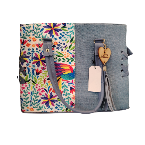 BOLSA DE HOMBRO CON ESTAMPADO DE COLORES ALEGRES, COSTURAS DEFINIDAS Y CON ME DIDAS DE 35 x 35 cm.