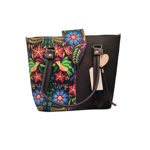 BOLSO NEGRO CON ESTAMPADO COLORES ALEGRES DE FLORES Y COLIBRIES, CUERO SINTETICO, ASAS A LA MEDIDA PARA HOMBRO, HERGONOMICA.